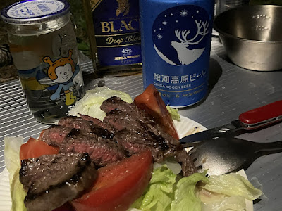 タリアータと呼べるものかは実は知らないが、スーパーで買ってきた岩手黒牛なる肉をレア目に焼いて薄切りにしたものだ。ビールも銀河高原ビール(いまやオリオンビールに買収されて近所のスーパーでも買えるけど)。実に美味い。やはりキャンプは肉だな。